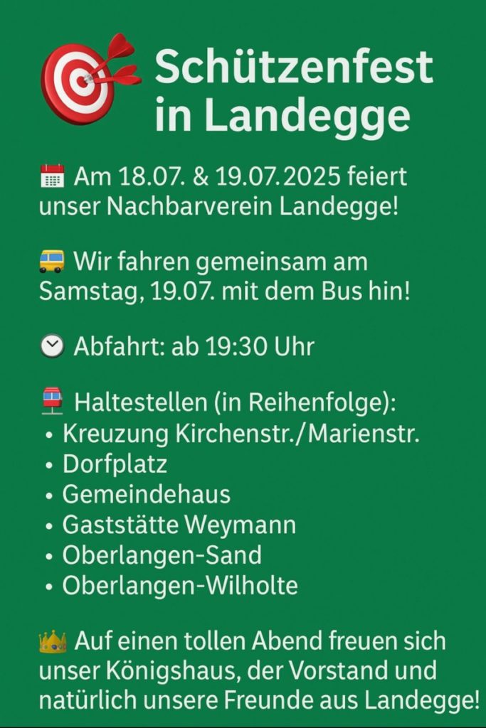 Hallo Schützenbrüder und Schützenschwester, nachdem wunderschönen Start in das Schützenjahr 2025 mit unserem Schützenball, steht das nächste Event vor der Tür. Wir fahren zum Schützenball nach Niederlangen am 31.01.25. Abfahrt ist um 19:00 Uhr in Wilholte und dann an den bekannten Haltestellen im Ort. Also auf geht es zum Auswärtsspiel. Euer Vorstand